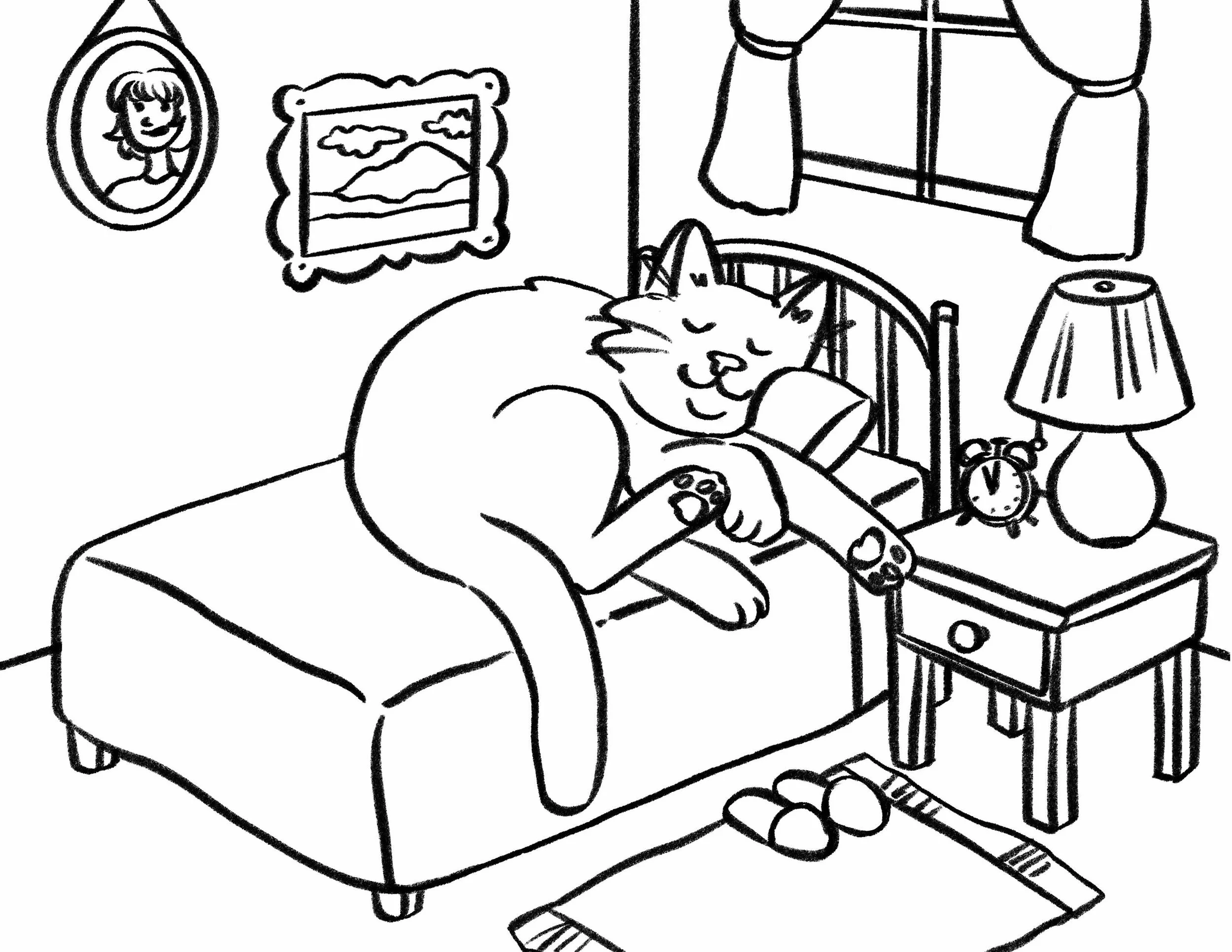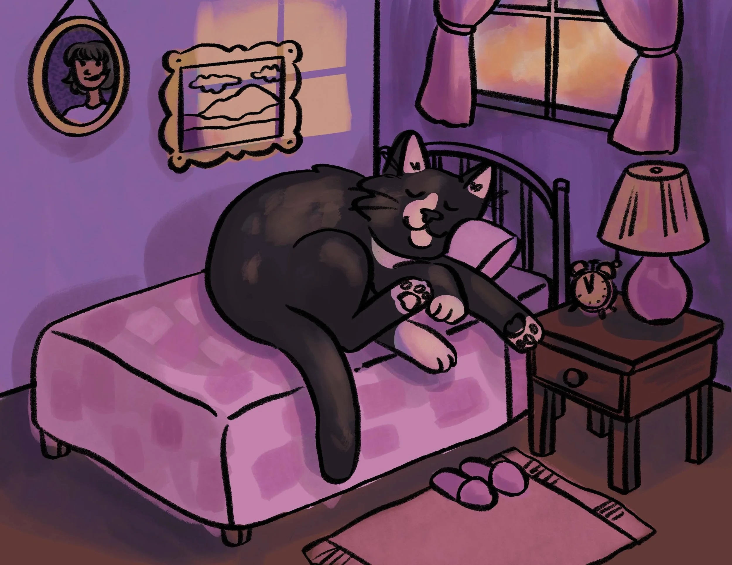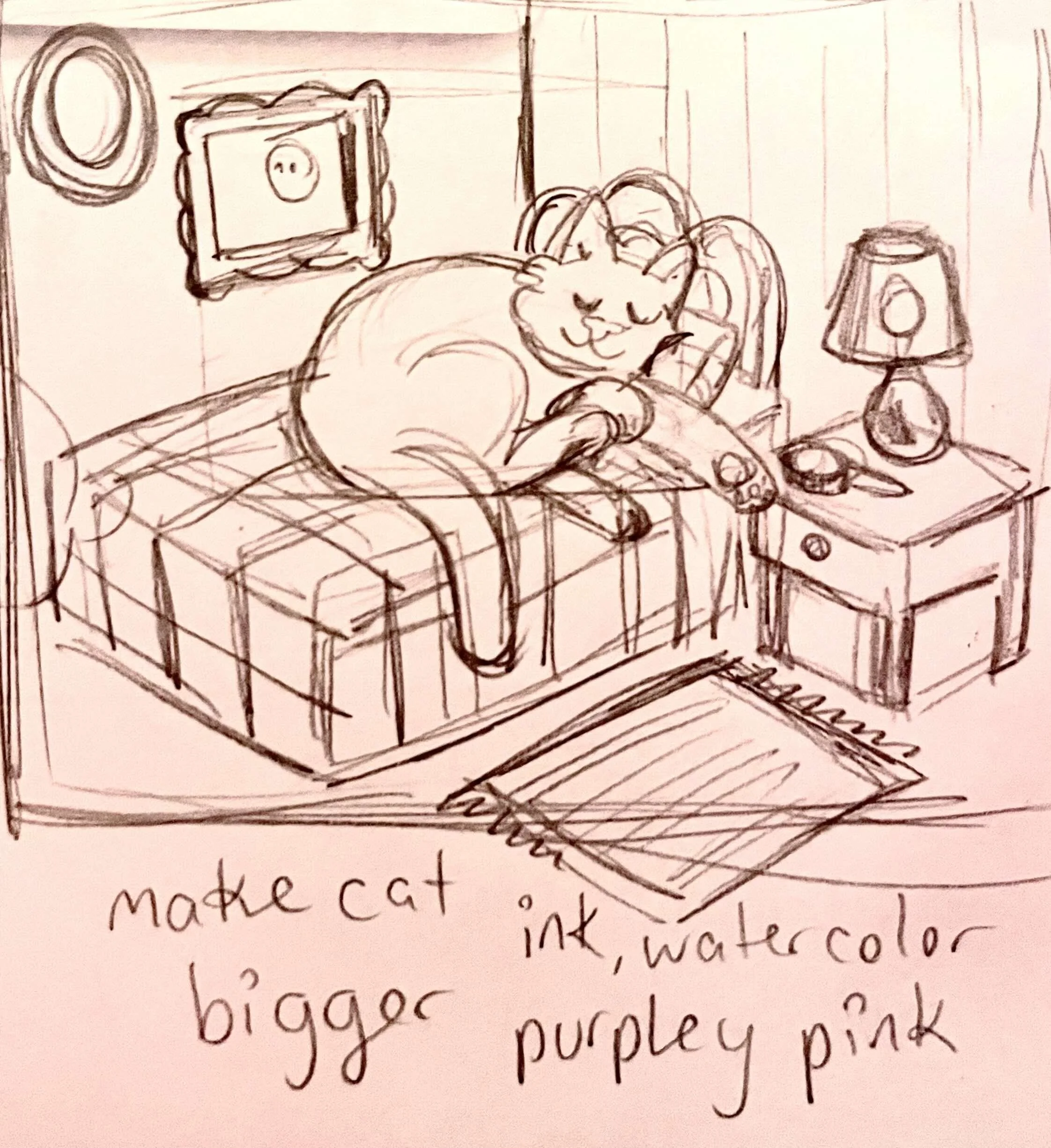 Inspired by a video of a cat sleeping in a doll bed, I painted a tuxedo cat asleep in dollhouse bed using watercolors and india ink. The kitty is surrounded by various dollhouse furniture belongings, like tiny doll slippers, a doll portrait, and a plush pillow.