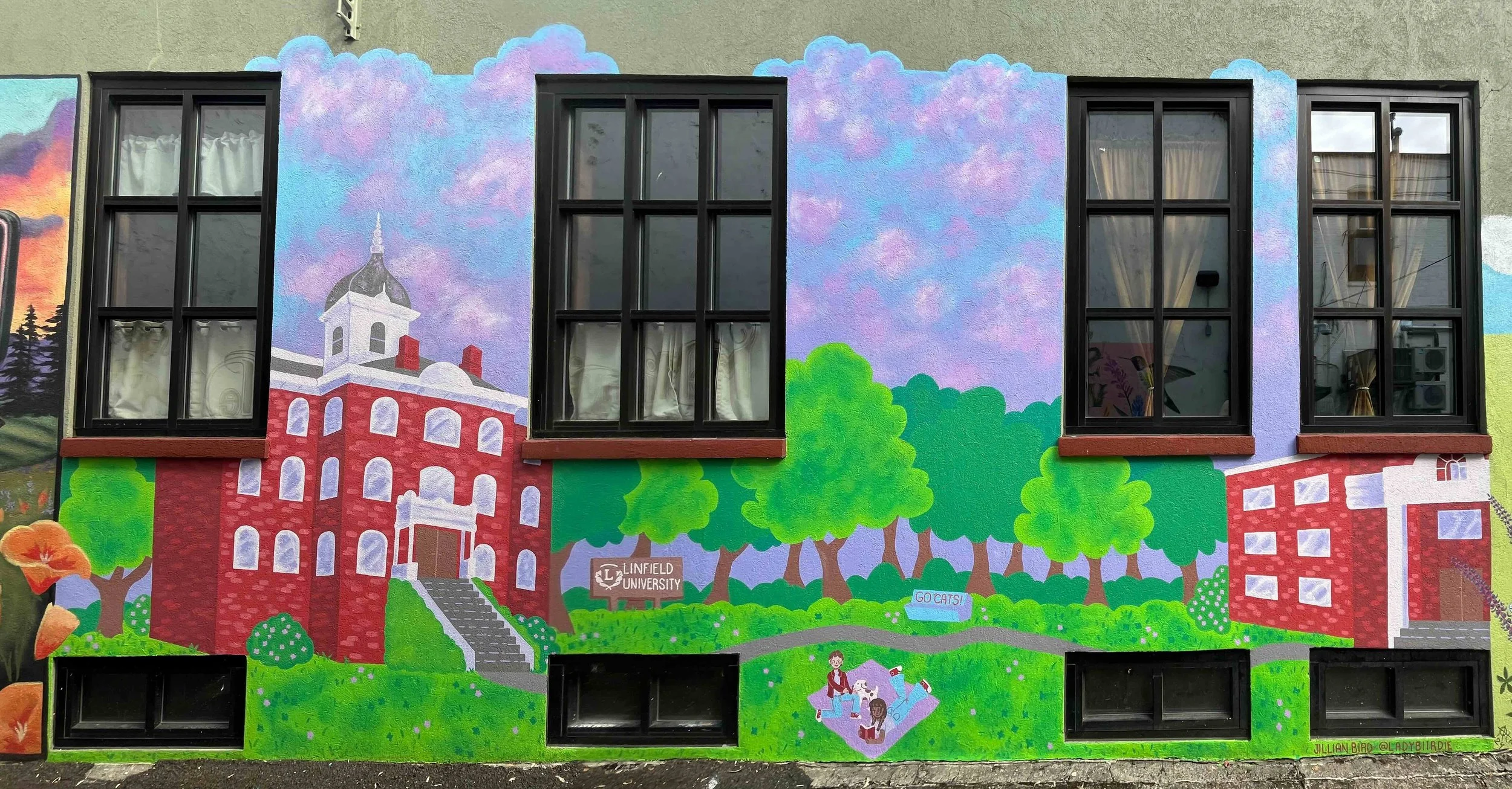 As I worked, many community members stopped by to talk or cheer me on, many sharing memories of their days at Linfield. That’s what I live for: projects that interact with a community while also giving more to it. It is my first and only mural depicting a building with a supposed cow ghost!